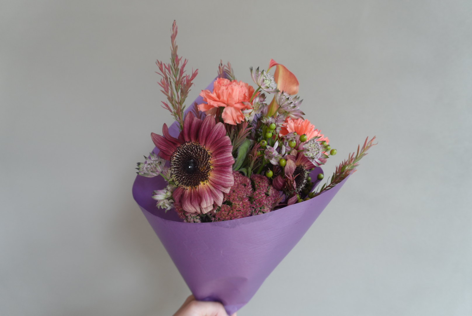 このブーケには、季節ごとに美しさが変わる花々が使用されており、それぞれの花が持つ独自の香りや色が相まって、見る人の心を和ませます。例えば、春にはラナンキュラスやスイートピーが組み合わさり、爽やかな香りを漂わせます。夏には赤いひまわりが加わり、インパクトある雰囲気を演出。秋にはコスモスやダリア、冬にはポインセチアやシクラメンと、季節に応じた最適な組み合わせをお楽しみいただけます。