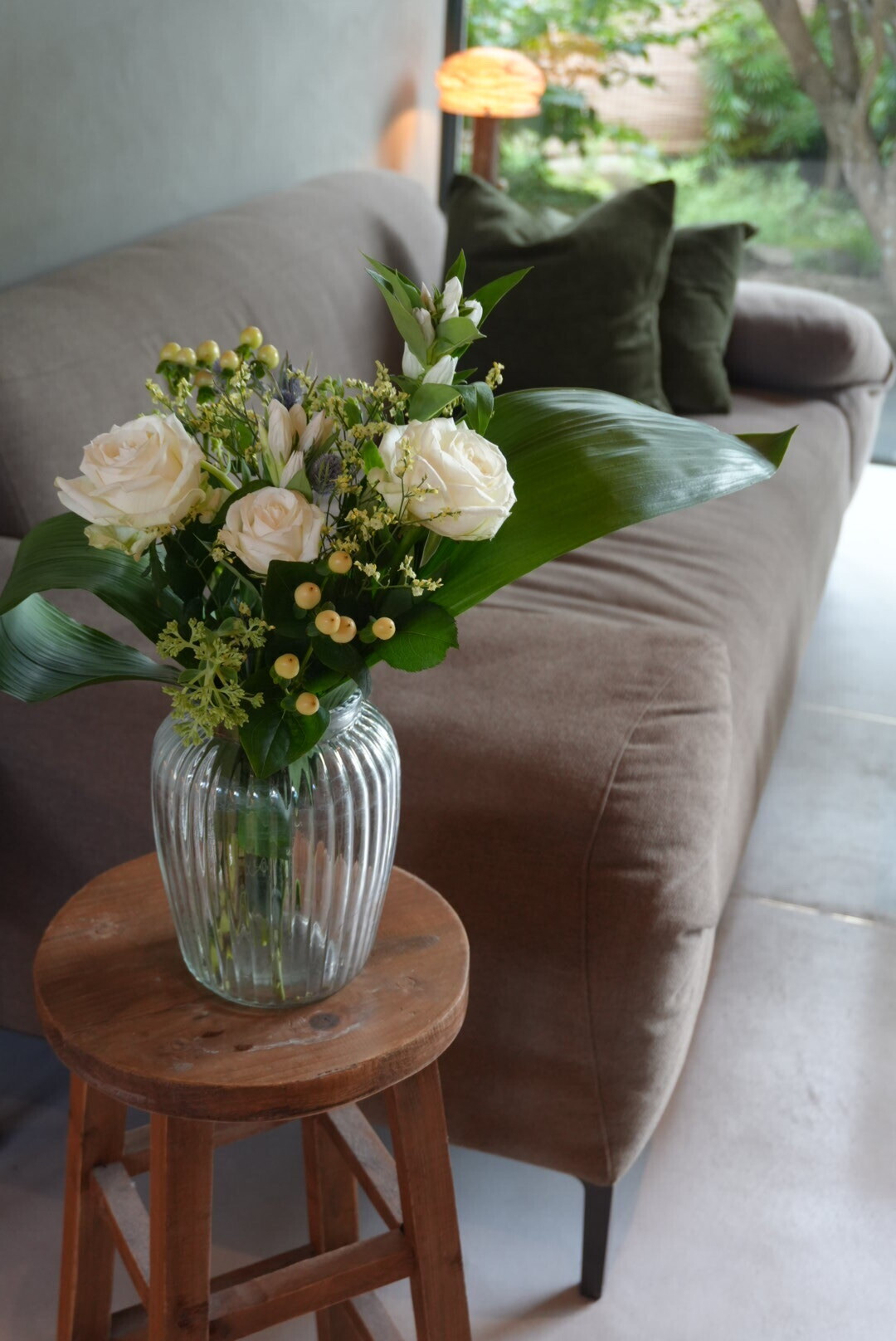 このブーケには、白いバラ、チューリップ、そしてフリージアなど、さまざまな花々が含まれています。